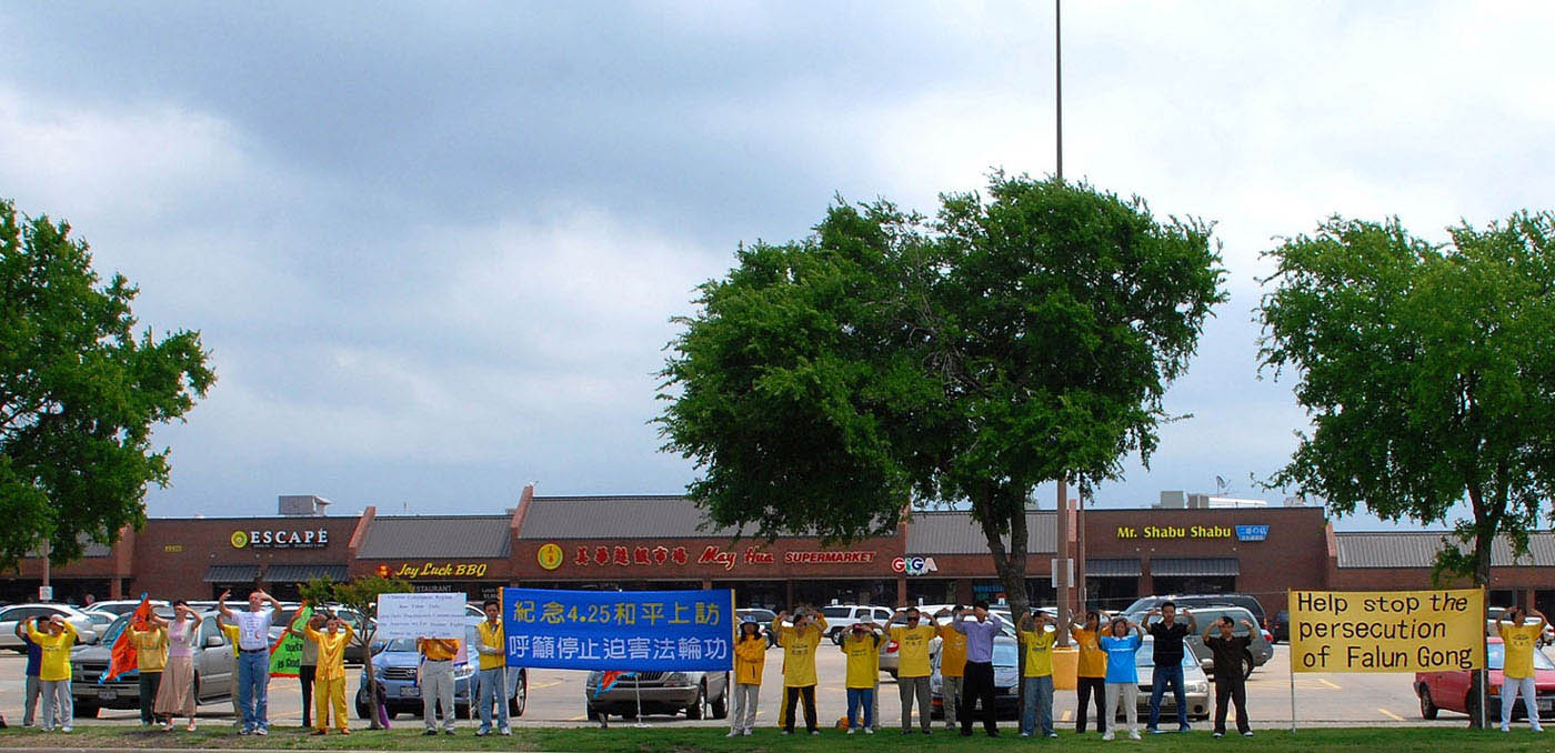 ![]() 达拉斯法轮功学员在布兰诺市美华超市前集体炼功,纪念“四•二五”十周年 |