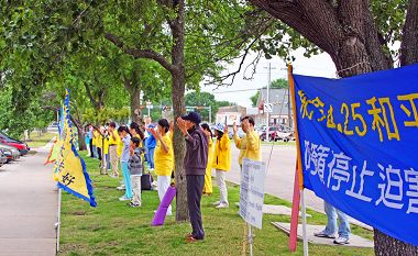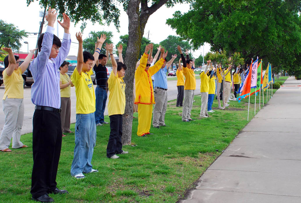 ![]() 达拉斯法轮功学员集体炼功,纪念“四•二五”十周年。 |