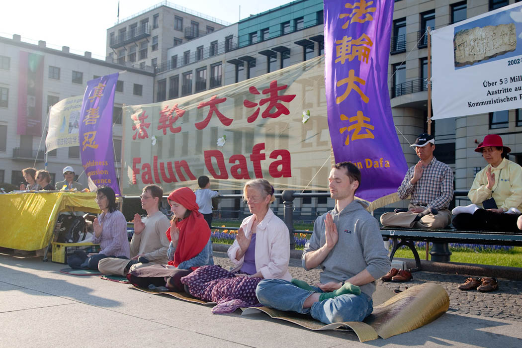 柏林当天春光明媚、碧空万里,在户外活动的人群络绎不绝,人们驻足观看揭露中共迫害法轮功的有关展板,并在制止中共迫害法轮功的签名簿上签名。