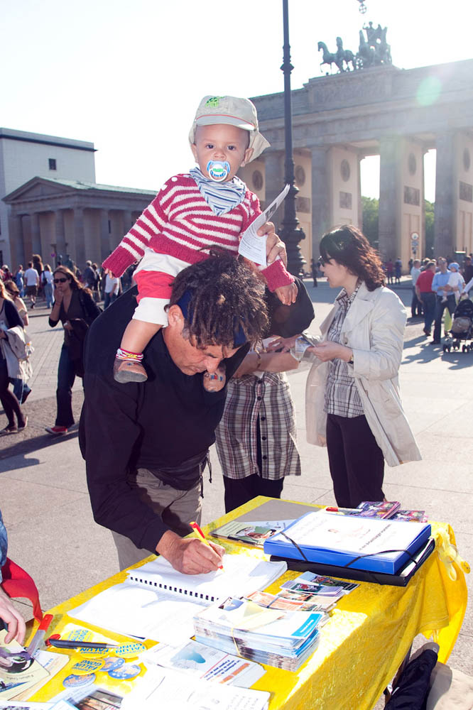 ![]() 在柏林勃兰登堡前签名支持制止迫害的父亲 |