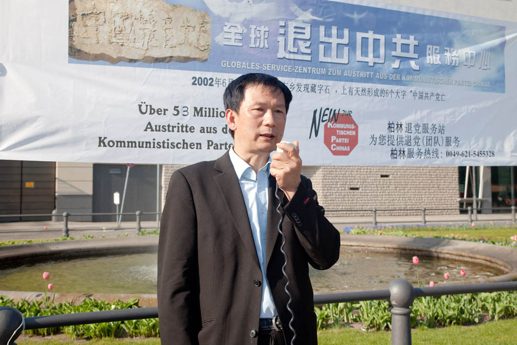 张明,一位来自天津的大陆人特意从别的城市赶到柏林,在集会上公开退!党!。他在接受采访时提到,当中共开始迫害法轮功时他才注意到法轮功,但他也不清楚是怎么一回事。后来在他公司里(天津运输大队)有一对夫妇,女的炼法轮功,男的叫杨泉,不炼法轮功,他得了股骨头坏死症,花了很多钱也治不好,单位也不给报销,钱也借不来。为了不想拖累家人,杨泉后来就自杀了。后来这件事情就被当作诽谤法轮功的素材,说杨泉是练了法轮功自杀的,当时这件事情在他们公司里引起了震动,人们不明白为什么会是这样。