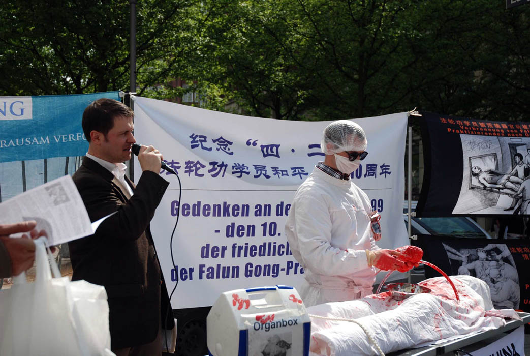 在汉堡,法轮功学员分别在中领馆和市中心闹市区举办了讲真相活动。在市中心,法轮功学员不仅摆上了展板,他们还进行了模拟中共活体摘取法轮功学员器官的表演。很多德国人看了之后非常震惊,纷纷签名支持制止中共迫害法轮功。