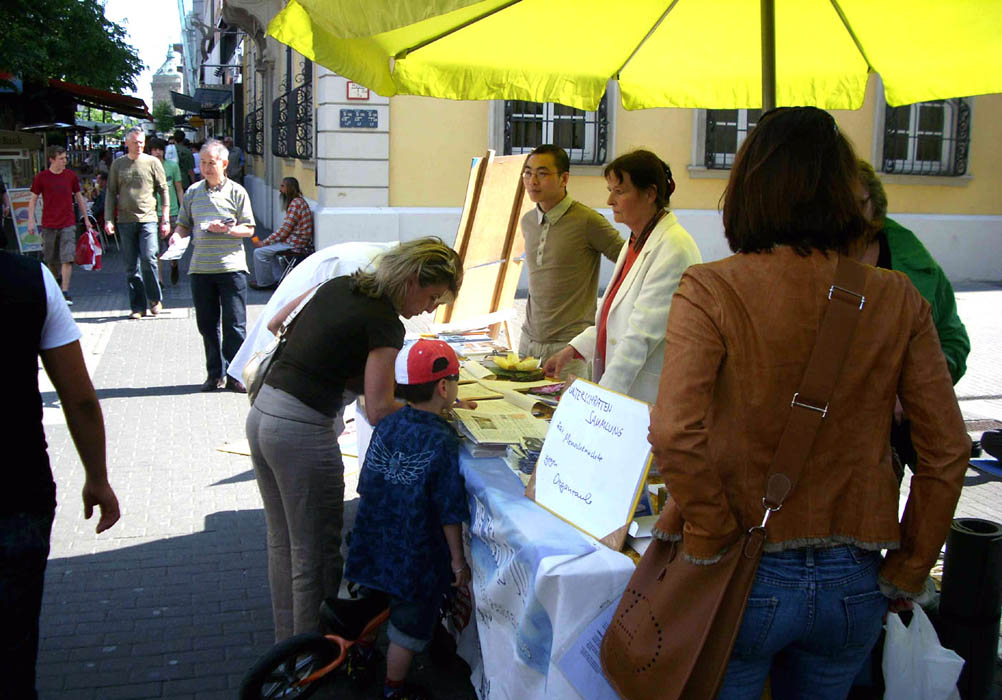 在市中心举办了活动,前来观看展板和信息台签名的人很多。一些年轻人当即表示要来学炼法轮功。