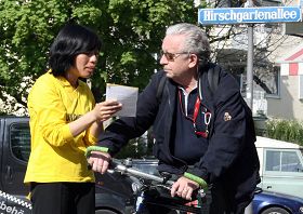 慕尼黑及周边地区的法轮功学员在中领馆前举办了纪念四•二五和平上访十周年,制止中共迫害法轮功的活动。由于周末天气好,在附近著名的景点纽芬堡还有两对新人举办婚礼,因此路过中领馆的人非常多,他们被法轮功学员祥和的炼功场景所吸引,不少人停下脚步与法轮功学员交谈,了解真相。