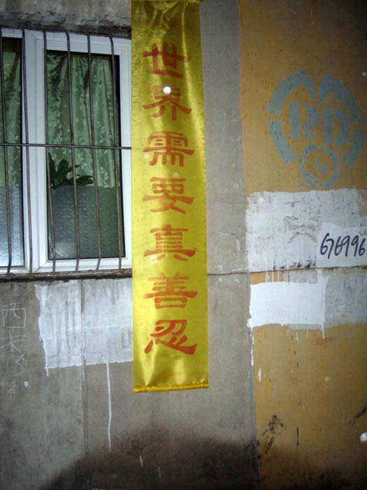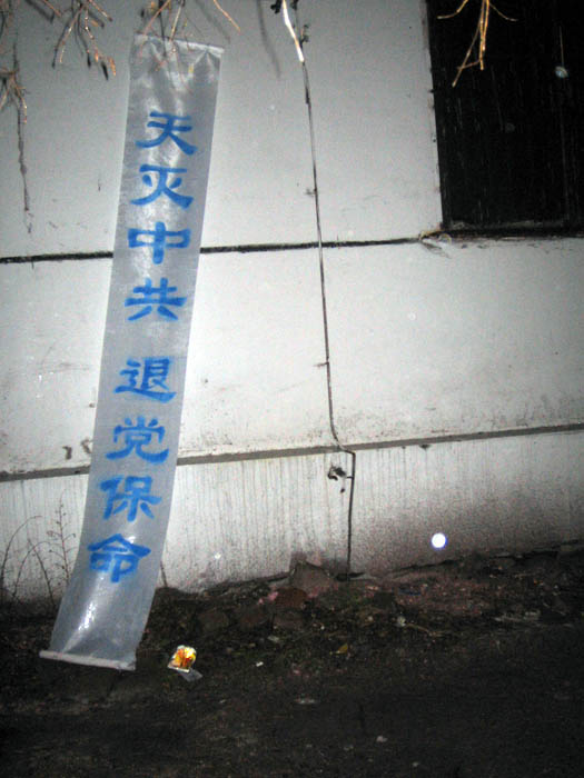 4月24日晚,黑龙江大法弟子为纪念10年前4.25法轮功学员和平大上访,为了让人们了解真相,出外悬挂条幅,条幅上写有“法轮大法好”、“世界需要真善忍”、“天灭中共 退!党!保命”。