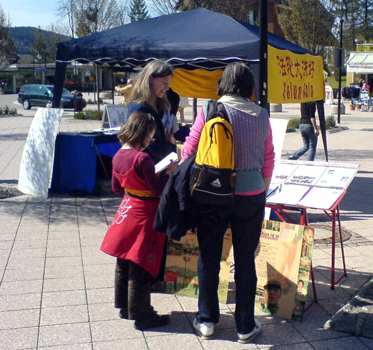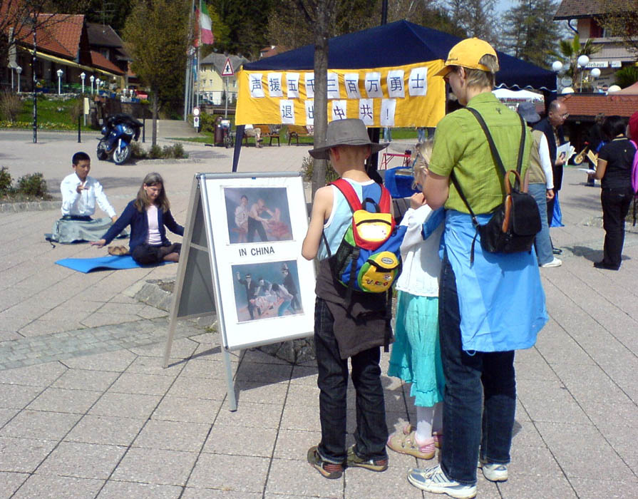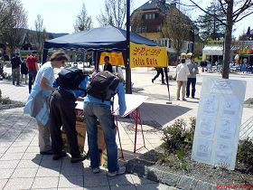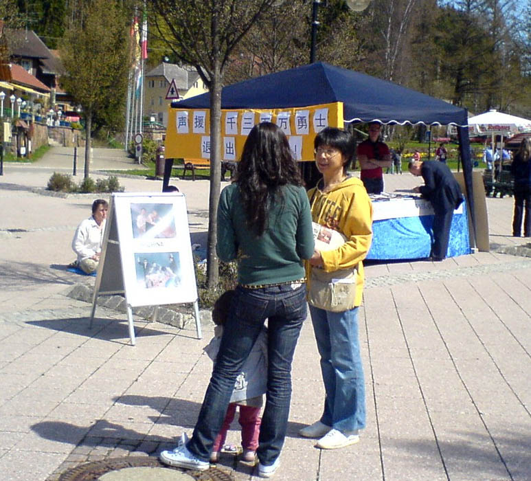 一位在此定居的大陆女士,指着“声援5千3百万勇士退出中共!”的横幅说,自己在欧洲定居了,和共产党没关系了,已经远离中共了,不用退了。经学员讲真相后她明白了,最后请学员给自己起了一个吉利好听的名字,高高兴兴做了“三:退.”。