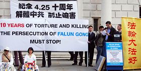 十年后的这一天,英国法轮功学员在伦敦中共使馆前举行和平抗议活动,纪念“四•二五”十周年,呼吁制止中共对法轮功已持续十年的非法迫害,同时,悼念为信仰“真、善、忍”而被中共残酷迫害致死的中国大陆法轮功学员。