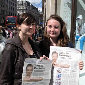 ![]() 游行途中,向法轮功学员表达支持两个英国女孩 |