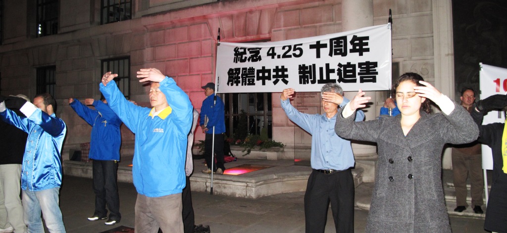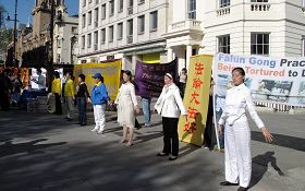 ![]() 法轮功学员在伦敦中使馆前的集体炼功与和平抗议 |