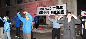 ![]() 法轮功学员在中使馆前的烛光悼念活动 |