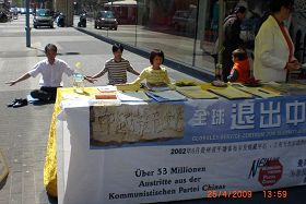 展台也吸引了过往华人的注意,一些人接收了真相小册子和《·九·评*共产党》的光盘,还有的当场退出了中共。征签展台的左侧是中共对大法弟子活体摘取器官的残酷恶行的详细介绍。许多行人在那里凝神观看,表情肃穆。右侧是《法轮大法洪传世界》的报道,一幅幅来自世界各地优美祥和的炼功图片又让行人心生向往。