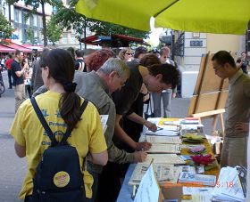 阳光明媚,音乐悠扬,大法弟子祥和的炼功场面吸引了许多行人驻足观看,一些人当场索要炼功信息。在宁静庄重的炼功学员前方摆放着反迫害征签的展台。展台前面一片繁忙,一些行人接过传单认真阅读;一些人询问这场迫害的原因与惨烈程度;一些人明白了真相后自发的在“抗议对大法弟子活体器官摘取的征签表”上签名支持法轮功。