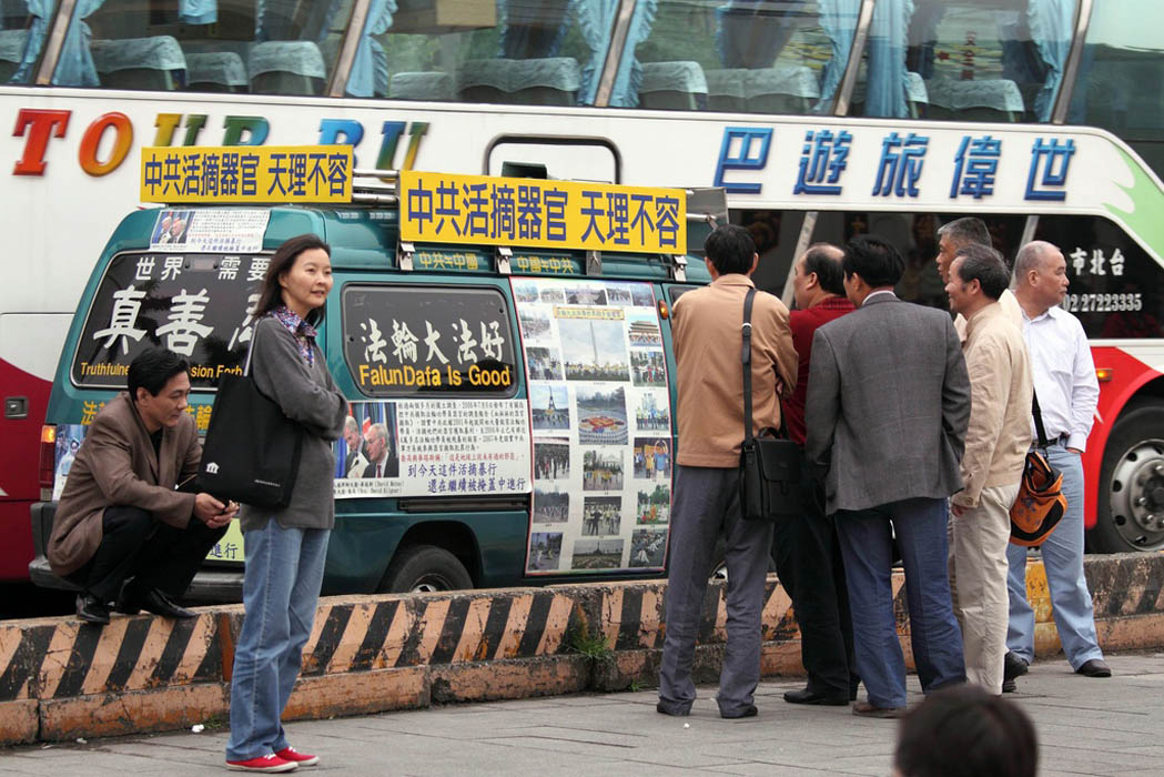 ![]() 大陆游客聚集在自由广场前观看法轮功真相广播车内容 |