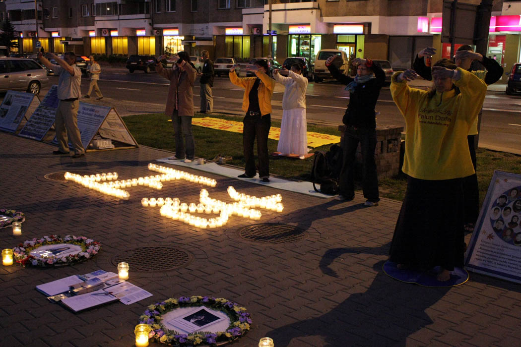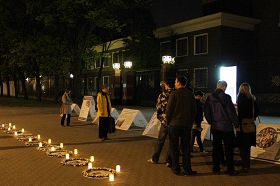 今天,学员们点燃蜡烛组成“正法”二字,九个花圈代表三千多被迫害去世的大法弟子。过往行人纷纷驻足,惊讶发生了什么事情,学员们发放传单,讲解十年前发生在中国北京的所谓“围攻中南海事件”真相。