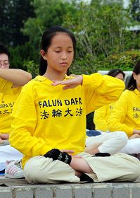 ![]() 台湾中区学员在“地方行政研习中心”的广场上演炼功法 |