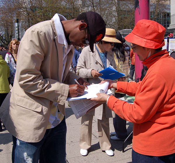 来自中国大陆的一年轻男士毫不犹豫地在请愿书上签名支持法轮功,他说:“我不相信谎言,只相信真相与事实。”来温哥华两年了,他表示自己不希望看到法轮功学员在中国遭受的那些折磨,“希望你们少承受一些,希望你们可以自由地炼功。”
