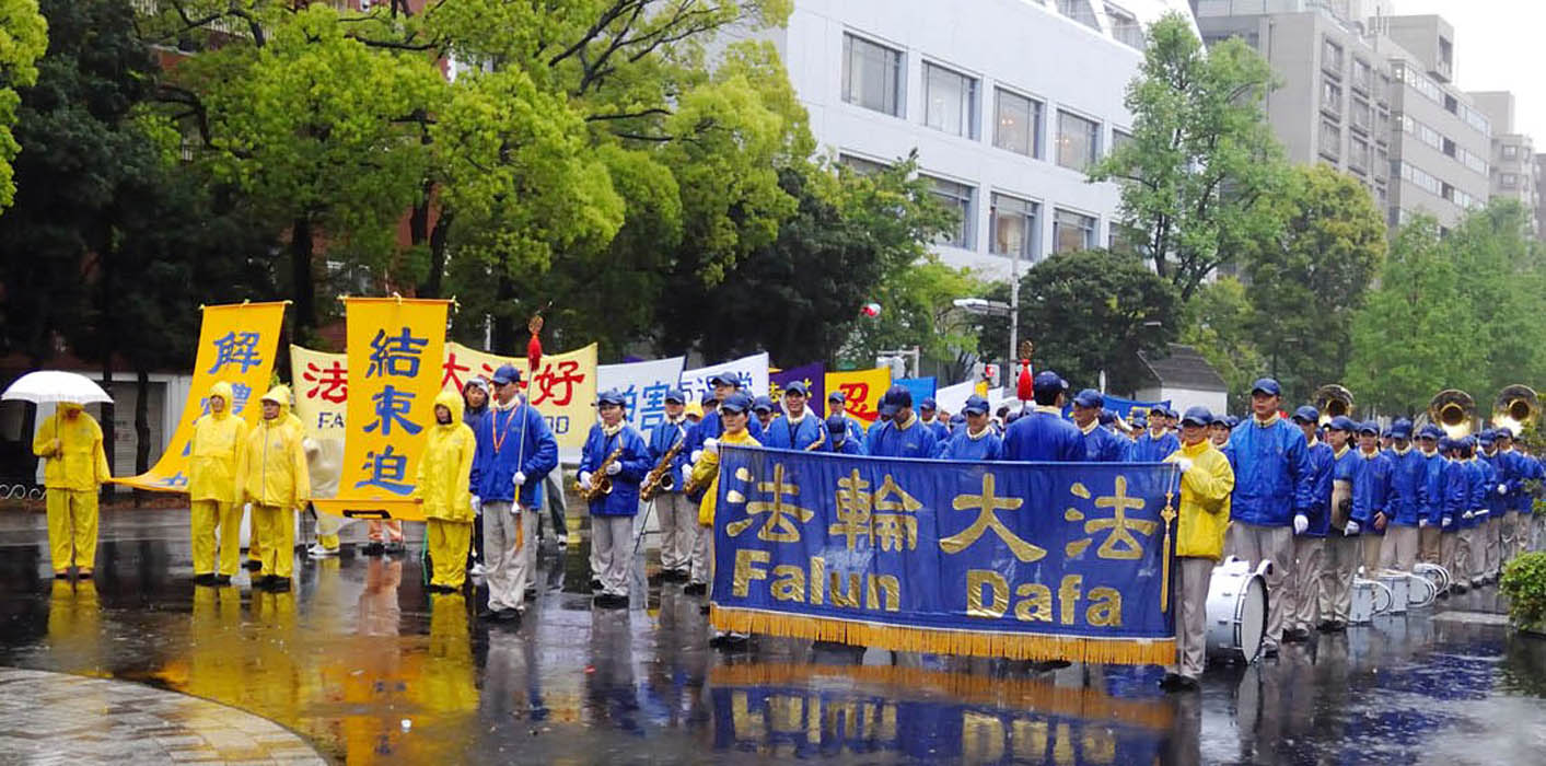 下午两点在雨中法轮功学员开始在横滨市内两个小时的游行。游行队伍由天国乐团作先导,许多学员手举“解体中共 结束迫害”、“法轮大法好”等横幅,队伍中还有学员通过扩音器一遍遍反复地向路人介绍什么是法轮功和法轮功遭受中共迫害的真相。人们看到这支在雨中行进的队伍非常关注,纷纷驻足观看,天国乐团冒着大雨的演奏更是令人震撼。