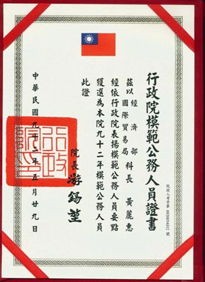 二零零三年五月黄丽惠获颁行政院年度模范公务人员殊荣,该奖表扬对国家社会具有特殊贡献事迹的六十名公务人员,这是全台湾数十万名公务人员的最高荣誉。同事长官咸感与有荣焉,认为她足为楷模实至名归。当时任科长的她,第二年年初已荣升“多边贸易组”副组长。