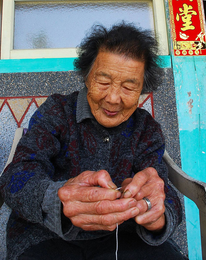 在这个海拔九百多公尺的村庄里,我见到了老阿嬷,满脸的皱纹掩不住盎然的生气,她讲话的声音仍然铿锵有力;住在山上远离城市,缝缝补补是常有的事。“说话不能说谎话”,阿嬷坐在藤椅里右手拿着线头,往嘴里沾了水,眯起眼睛,果然两三下就把线头穿过了针孔:“你去问问我的孙子,我媳妇的针线穿不妥时,孙子就会向她母亲说,叫阿嬷帮你穿针啊。”