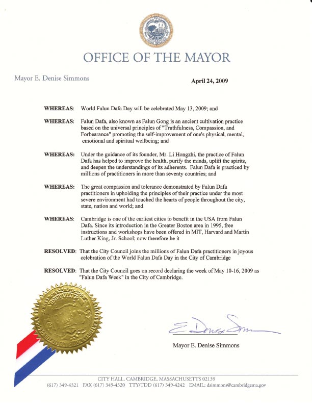鉴于:剑桥市是在美国最早受益于法轮大法的城市之一。自从法轮大法于一九九五年传到大波士顿地区,法轮大法学员在麻省理工学院、哈佛大学及马丁路德金学校免费教授;特此
