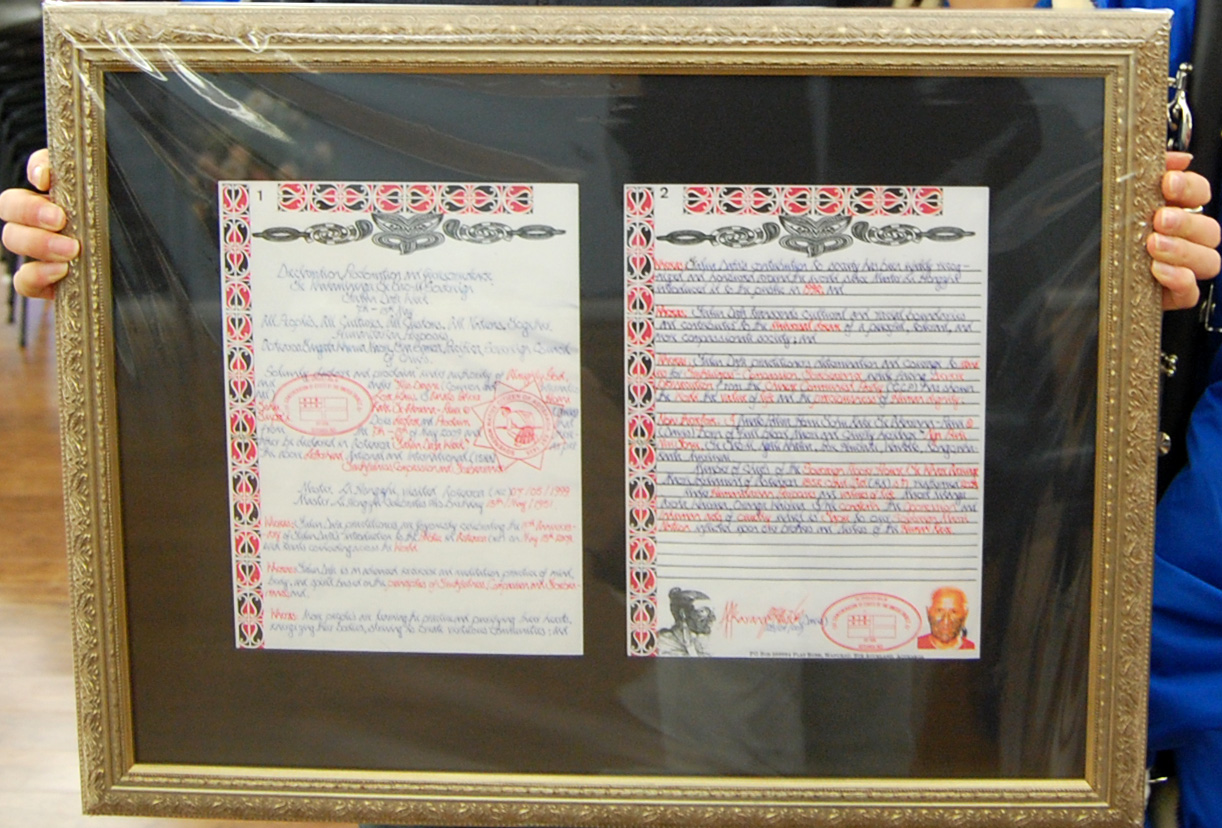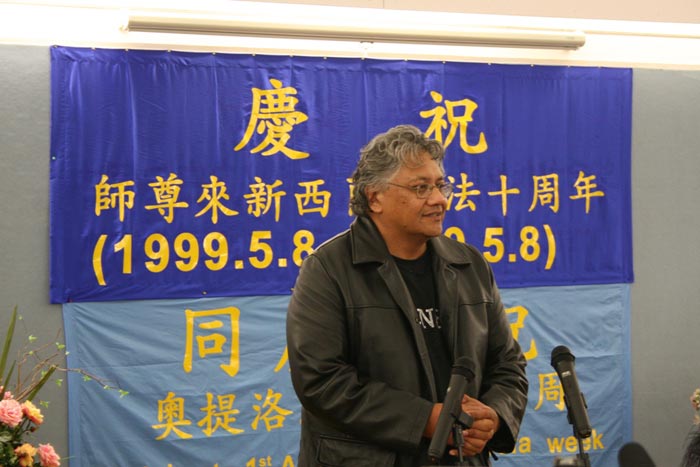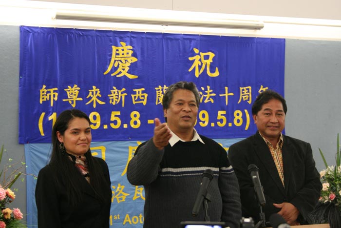 “今天,我带来了宣布新西兰法轮大法周的证书,上面有我们毛利酋长议会和毛利以及太平洋岛国的酋长议会的签名。我们在这个国家为你们祝福。我们在这里庆祝第一个奥提洛瓦(译者注:Aotearoa,毛利语,长白云之乡,指新西兰)法轮大法周。我在这里真诚的祝福你们,也感谢你们能让我、我的全家、我的部落和毛利民族能成为你们未来的一部份。”