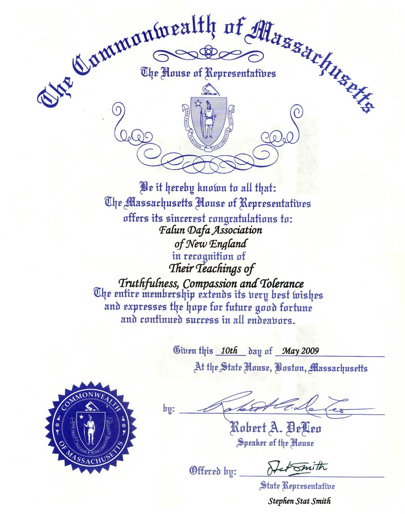 麻萨诸塞州众议院向新英格兰法轮大法协会致以最衷心的祝贺!褒奖法轮大法学员传播“真、善、忍”信念全体众议院议员献上最美好的祝愿,祝你们事事顺利,不断取得成功。