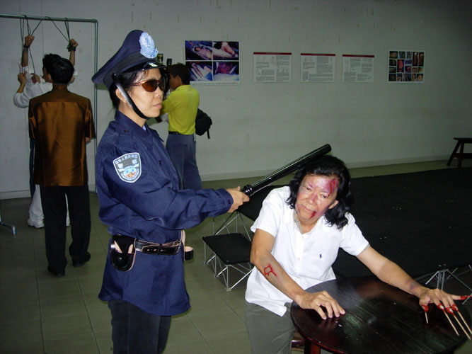 二零零五年二月十三日,泰国法轮功学员首次推出反酷刑展,真实呈现了中国大陆法轮功学员因坚持真善忍信仰,而遭受江罗集团非法镇压及残酷折磨的场面。