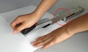 长臂订书机的妙处就在于通过调整挡架(下图中红色圆圈里的白色部份)的位置,可以使订书钉精确订在纸的中间(骑马钉的中缝处),从而使我们制作的真相资料更整齐、美观。