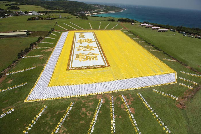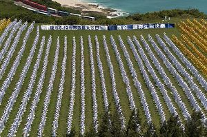 ![]() 二零零九年五月九日早上,台湾六千余名法轮功学员在南台湾风光明媚的垦丁风景区埔顶大草原,排出指导修炼的《转法轮》这本书 |