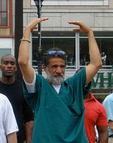 来自多米尼加共和国的医生阿卜拉罕(Abraham)也是模仿法轮功学员炼功的一个。他说:“我的背有毛病。我感觉炼法轮功非常好。我会炼的。”