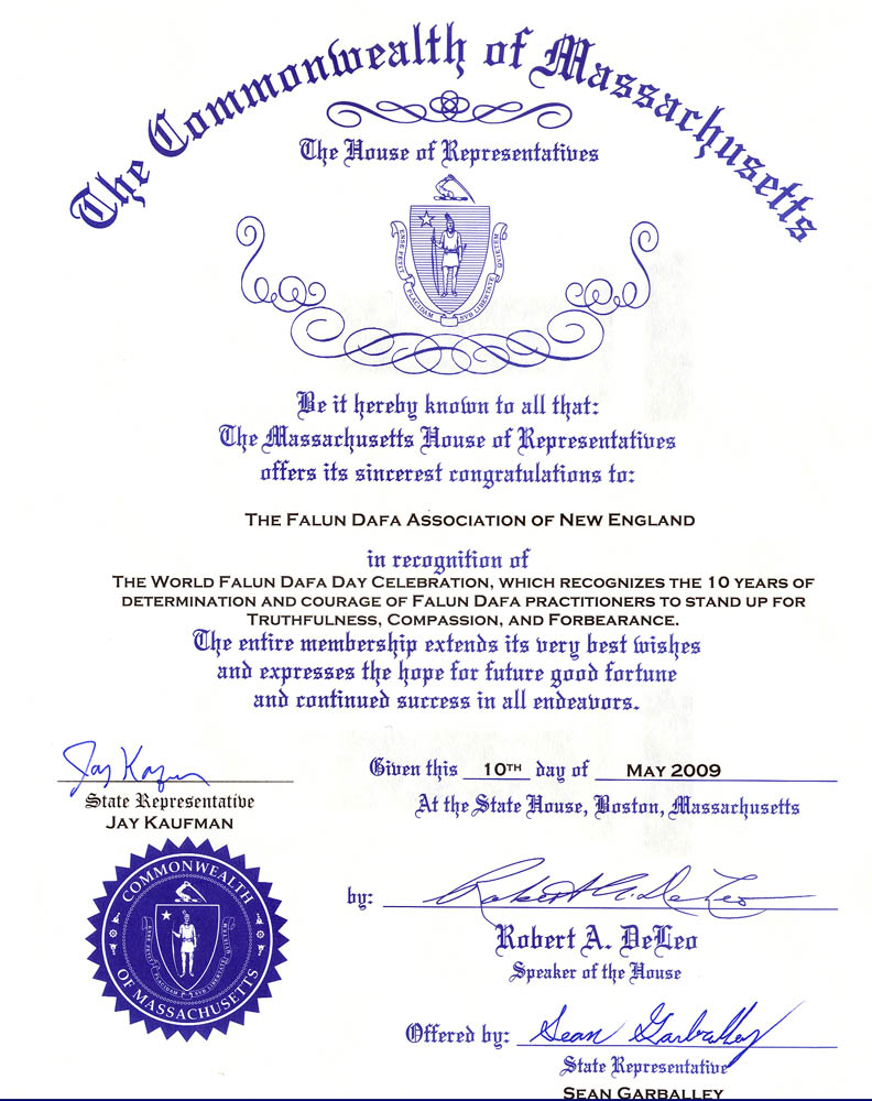 麻萨诸塞州众议院向新英格兰法轮大法协会致以最衷心的祝愿!