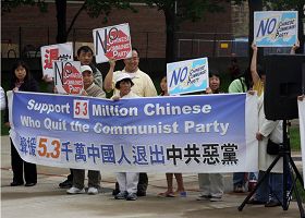 在堪萨斯市,一些中国大陆民众看到大卡车上的信息后,向退!党!中心的义工们微笑以示鼓励;