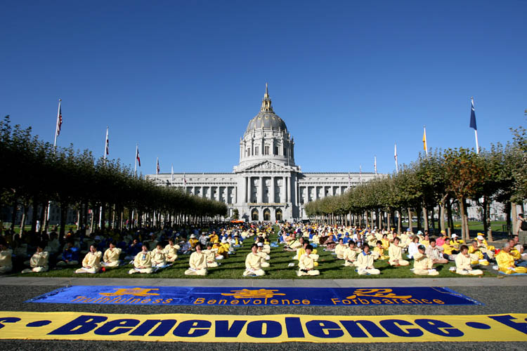 ![]() 美国旧金山法轮功学员在市政府前集体炼功 |