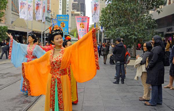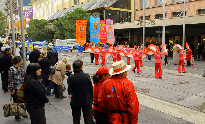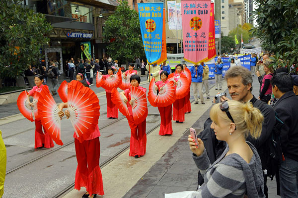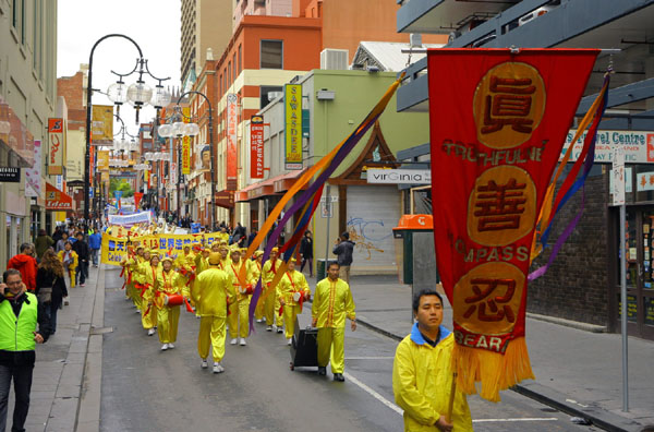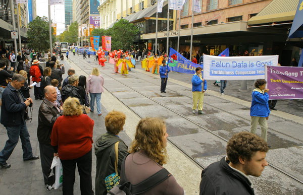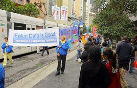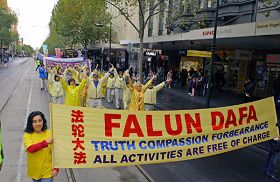 五月九日早上,深秋的墨尔本已颇有一番寒意,天空中飘着小雨,早上八点不到,学员们就集中在著名的旅游景点菲玆洛伊花园集体炼功。中午十二点,游行队伍从城市广场正式出发。腰鼓队击打着欢快的鼓点开路,“庆祝世界法轮大法日”的大型金色横幅与多面耀眼的标语烘托出一股神圣庄严的气势。游行中有功法展示、雍容华贵的唐装仕女、鲜艳的扇子舞、一片美好、祥和的气氛。街道两旁满是驻足观看的路人,共同分享法轮大法洪传于世给生命带来的喜悦与希望。游行中的酷刑展、模拟演示中共活摘器官等方阵,向民众展示了目前在中国所发生的残酷迫害,并传递出一个强烈的讯息:中共迫害法轮功已经十年了,现在必须马上停止。