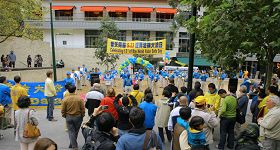![]() 在城市广场上,法轮功学员演示功法。 |