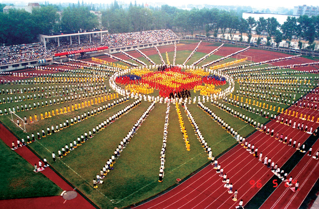 ![]() 迫害开始前的一九九六年,武汉法轮功学员集体炼功,组成法轮图形 |