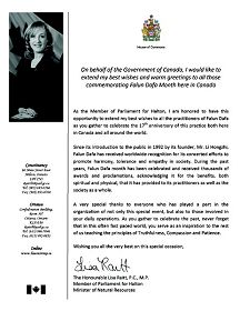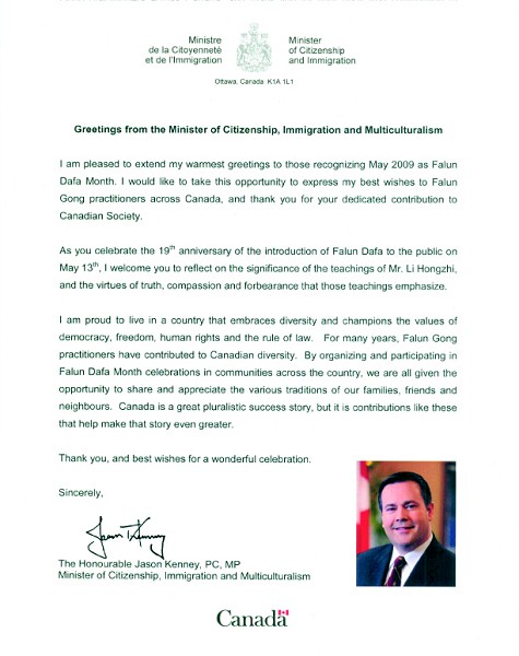 加拿大公民移民暨多元文化部长、国会议员杰森•肯尼(Jason Kenney)发来贺信,他说:“我希望借此机会向全加拿大的法轮功修炼者表达我最真挚的祝愿,感谢你们为加拿大社会做出的诚挚贡献。”