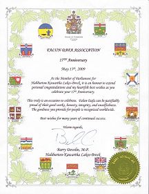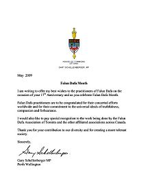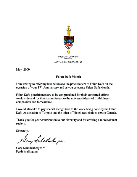 加拿大国会祖裔部委员会(Standing. Committee on Canadian Heritage)主席、联邦国会议员薛伦伯格(Gary Schellenberger)发出贺信,祝贺法轮大法传世十七周年,并向法轮大法的修炼者表示祝贺。