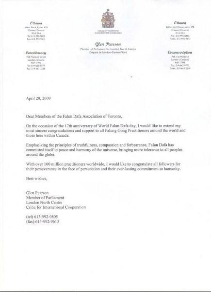 联邦自由党国会议员、自由党国际合作评论员皮尔森(Glen Pearson)在向法轮大法学会发出的贺信中说:“在国际法轮大法日来临之际,我要向全世界和加拿大的所有法轮功修炼者表达我最真挚的祝贺和支持。”