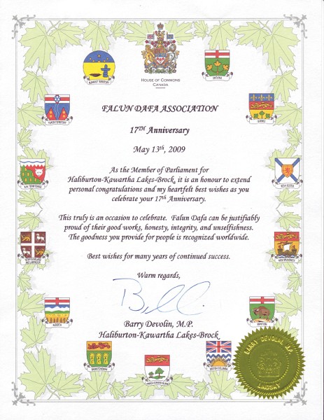联邦保守党国会议员狄奥年(Barry Devolin)在贺信中称:“很荣幸能在你们庆祝(法轮大法传世)十七周年之际表达我的祝贺和我发自内心的最美好祝愿。”