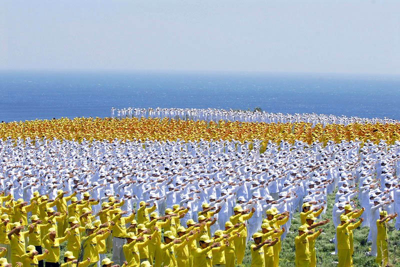在旋律悠扬的乐声中,六千余名法轮功学员缓、慢、圆地安详炼功,丝毫不受烈日当空及垦丁强劲落山风的影响,动作整齐划一,真是既壮观又宏伟。