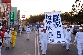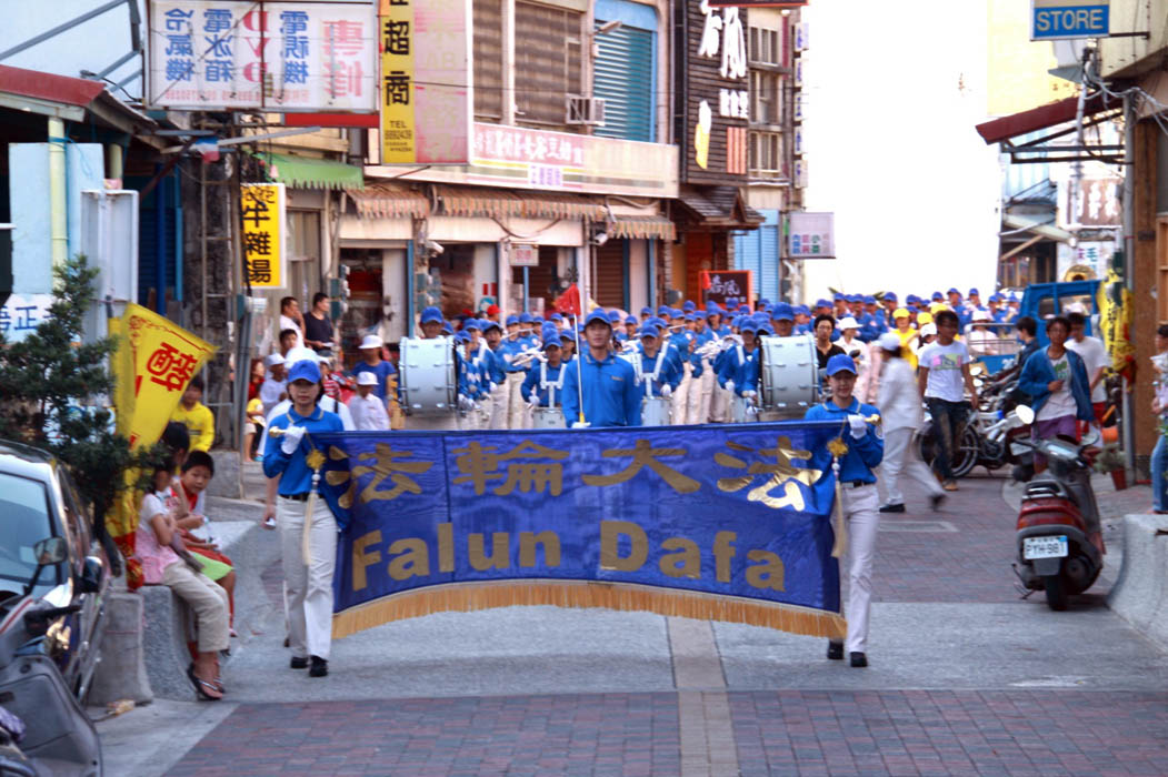 恒春古镇一年四季如春,还遗留两个古城门,让人怀思。最近因为拍摄“海角七号”一片而名噪全台,经常有游客来探访拍摄现场。今天法轮功学员来到恒春游行庆祝大法日,台湾南北两团组成三百多人的天国乐团,分别在游行队伍的前后,游行队伍中有腰鼓队,各式横幅飘扬其间,场面盛大壮观。两侧民众纷纷拍手叫好,也吸引了大陆来台旅游观光人潮的驻足观赏,并很高兴接受法轮功真相材料。