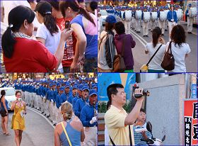 天国乐团和腰鼓队在雪白的鹅銮鼻灯塔前演奏“法轮大法好”、“佛恩圣乐”时,来自大陆福建和山东的观光客正好成团在附近观光,其中一个来自福建的旅游团,成员有南安、泉州等地的大陆民众,他们看到这么多的法轮功学员感到很惊讶,对天国乐团的演出很感兴趣,有的随着音乐拍手,有的拿起相机拍照留念。