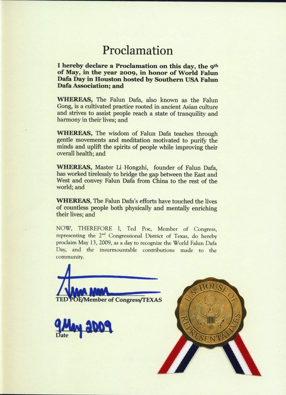 鉴此,我,泰德•鲍(Ted Poe),议会成员,代表得克斯州第二选区,在二零零九年五月十三日褒奖世界法轮大法日,以及其对社区所做出的不可超越的贡献。