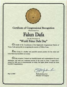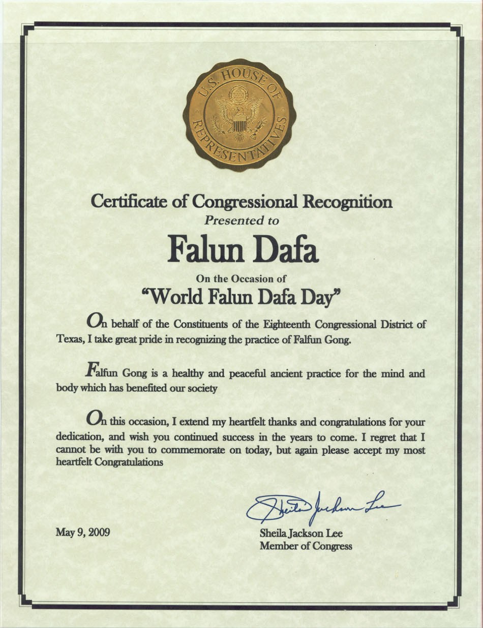 我谨代表得克萨斯州第十八选区的选民,在此非常自豪地褒奖法轮功功法。