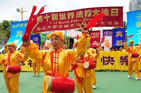 ![]() 腰鼓队欢快的表演,祝贺师尊华诞及庆祝世界法轮大法日 |
