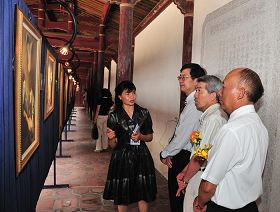 许秀英校长说,“宝成企业十名贵宾观赏了神韵艺术团三月份在台中的演出,其中《美展奇缘》讲述一位年轻人手臂受伤了,他到真善忍美展看到画作很棒,还有一群人在炼功,他就跟着学炼到忘我的境界,突然发现手竟然好了,这个缘份是很特殊的,如果来观赏这样的画作会带给大家福气。”由宝成企业协理的这段神韵奇缘促成了今天在一级古迹龙山寺所举办的“真善忍国际美术巡回展”,这也算是一场美展奇缘。