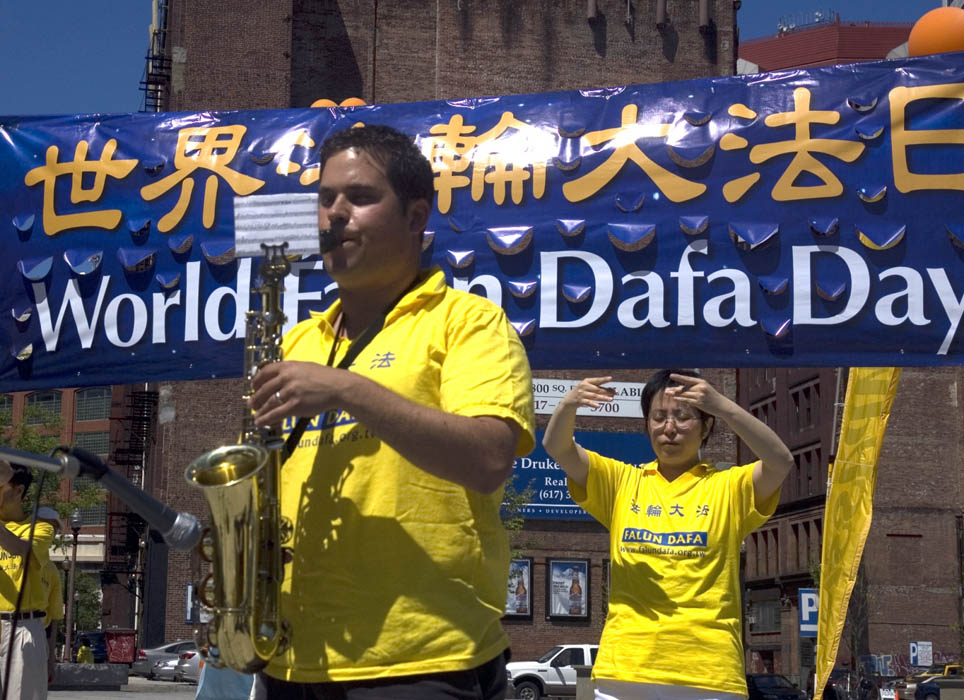 ![]() 波士顿法轮功学员以萨克斯风演奏《得度》 |