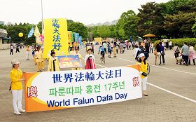 这一天,著名的奥林匹克公园里游客如云、人山人海。按照韩国的交通法则规定,游行是不能在公园内部进行的,可是,警察署却特例批准法轮功队伍可以在公园内游行。这支祥和的游行队伍顿时成为这一天公园里最亮丽的风景,民众们争相围观,踊跃索要传单。