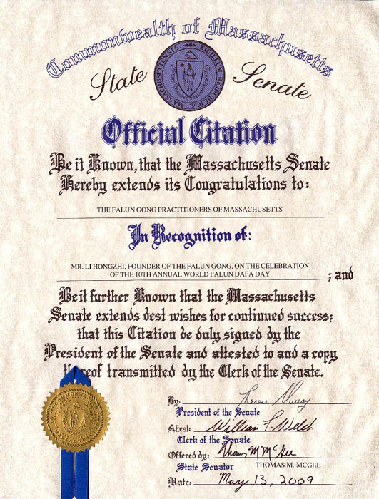 麻州参议院献上最美好的祝愿,祝不断取得成功。此褒奖状由参议院主席签署并由参议院秘书作证明和传递。